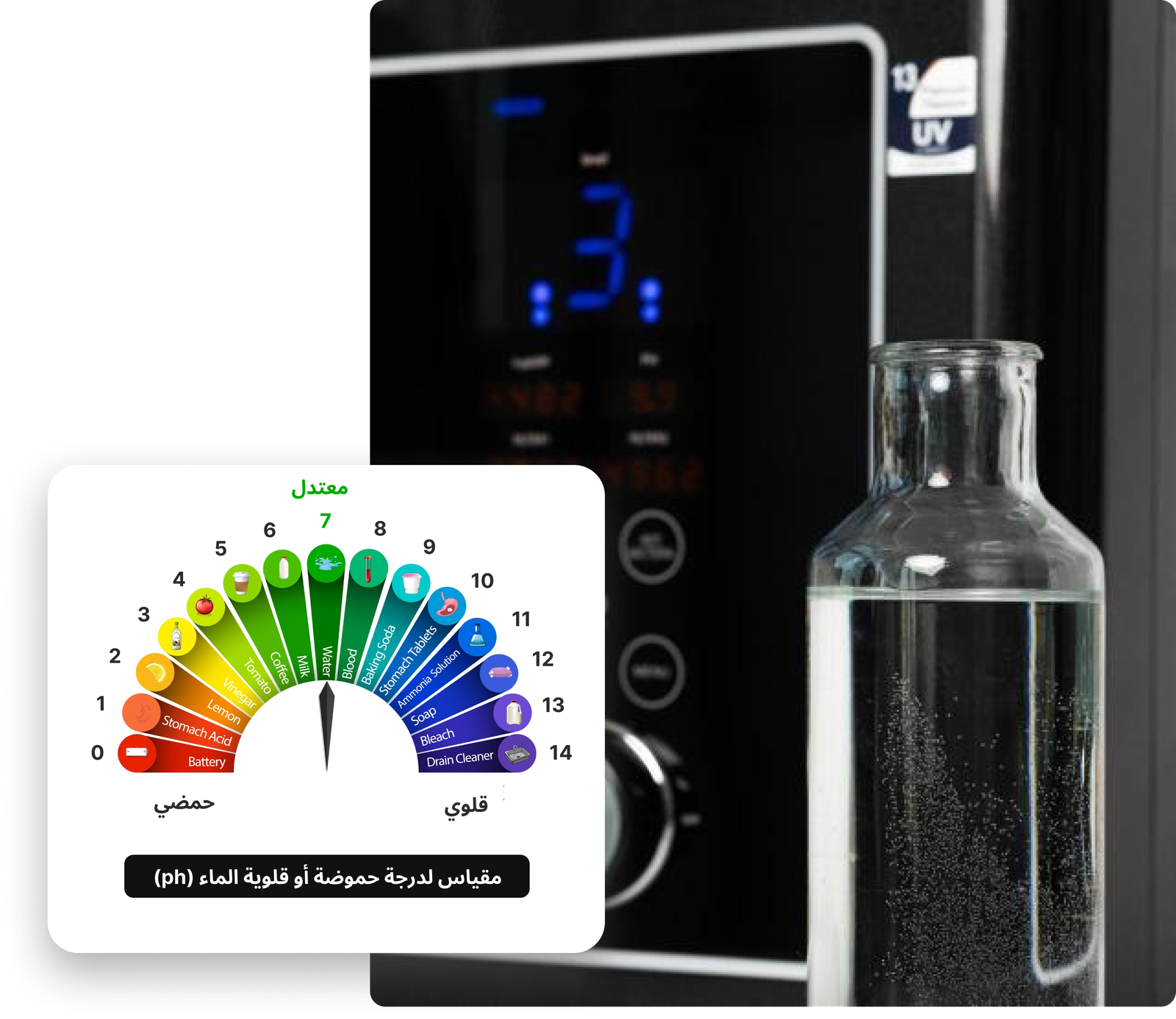 لمياه نقية وصحية بفضل نظام الفلترة المتقدم . تصميمه سهل الاستخدام مع إمكانية ضبط مستوى الحموضة بسهولة. فلاتره عالية الكفاءة ومواد آمنة تجعلها خيارًا صحيًا.